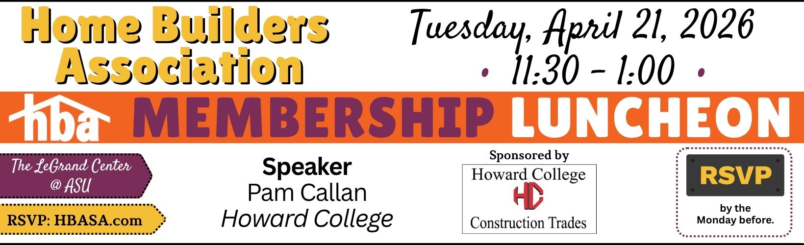 The Home Builders Association of San Angelo is a non-profit professional trade organization made up of the absolute best in the home building industry in the Concho Valley. We are comprised of builders and associate members who subscribe to the highest business and ethical practices and who are committed to fostering an environment conducive to help the growth of businesses within the construction trades industry. We are nearly 300 members strong working to build a better San Angelo one home at a time.